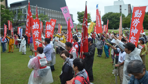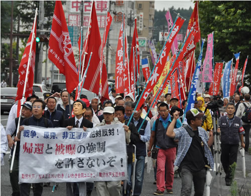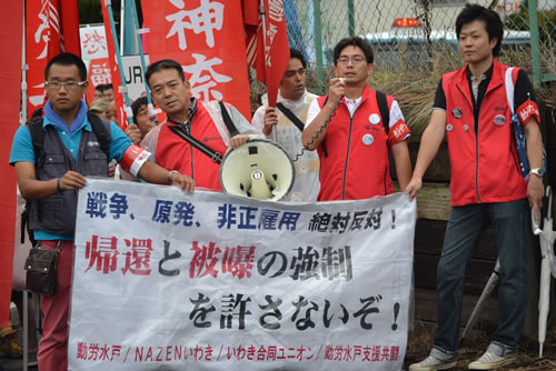 動労水戸の石井真一委員長が、「原発事故は収束していない。なのに楢葉に帰れ、補償も打ち切ると安倍は言う。帰還が始まれば鉄道、自治体、教育、郵政、NTT、水道、運輸などすべての労働者に被曝が強いられる。労働組合として絶対に許せない」と怒りをたぎらせた。そして、「JRは常磐線を全線開通させるため、バラストを交換してどれだけ線量が下がるかを調べる工事を始めた。動労水戸は団交を要求したが、JRは応じていない。労働者が被曝しても関係ないという態度だ」とJRを激しく弾劾。また「労働組合が被曝や戦争に何も言えなくなった時に戦争は始まる。原発を止め、安全に収束作業を進めるためには原発労働者の労働組合が必要だ。原発労働者と連帯し、被曝労働を拒否する労働運動を全国につくろう。安倍を打倒し労働者が人生をまっとうできる社会をつくろう」と力を込めて訴えた。