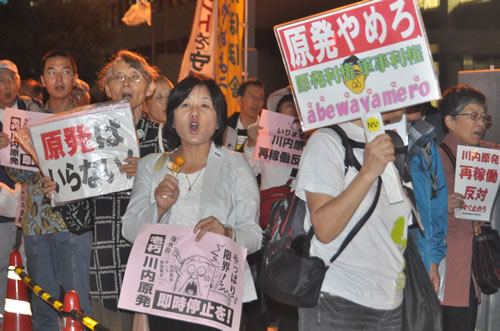 いつも発言する男性は「川内原発の復水器の配管穴あき事故の原因はいまだ特定されていない。30年を超えた法令違反の原発は動かしてはならない。私たちはあさって、この場に10万人、数十万人を集めて君たちに抗議に来る。覚悟して待ちなさい」と述べた。