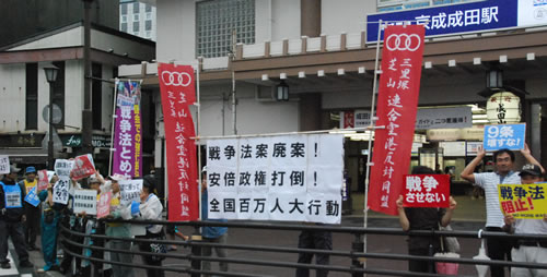 8月30日午後、三里塚反対同盟と支援連は、「戦争法廃案・安倍政権打倒」の国会12万、全国100万人の行動と連帯し、京成成田駅西口での情宣活動に全力で立ち上がった。小雨の中、市東さん農地決戦の最高裁5万人署名を呼びかけ、第3滑走路計画と安倍戦争政治との一体性を暴き「戦争反対!」を訴えた。午後2時と3時を期して、東京方向へ向け全員でシュプレヒコールを上げた。