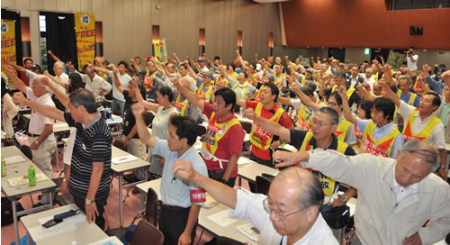 共同代表の平良修さんが閉会のあいさつを行った。平良さんは「私は沖縄にこだわっています。沖縄のことにこだわって重荷を負う結果になった人を放置できない」と語り、「すべての都道府県を網羅する救援会をつくりましょう。国際的な連帯の中で外国に救援会をつくってもいい。大胆に全国・全世界を挙げて、星野救援運動の実体をつくっていきましょう」と呼びかけた。最後に意気高く団結ガンバローを行い、翌日の徳島刑務所デモへの決意を固めた。