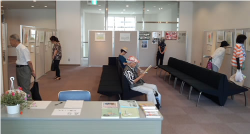 絵画展当日は隣県徳島の仲間の協力を得て、予想以上に盛り上がりました。さらに、初日の開催直後に仲間からの差し入れで、「会場に飾ってください」と鉢植えの花と、「皆さんで食べてください」とお菓子をいただきました。2日間の来場者は約100人、署名数39筆、カンパ2万5千円、『愛と革命』4冊が販売されました。