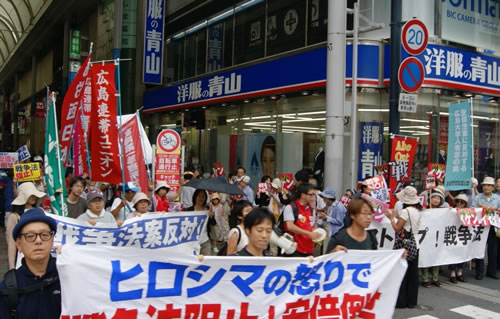 8月30日午後、広島で「安倍政権による戦争法制定絶対反対!」の集会とデモを行いました。動労西日本、広島連帯ユニオンと広島大学学生自治会の闘う仲間が参加しました。このデモは、8・30の国会前12万人、全国100万人の行動とひとつになって闘われました。デモは原爆ドーム前から八丁堀・福屋を一周して、原爆ドームを折り返し、市内中心部の繁華街の本通りアーケード街を往復するコースです。圧倒的な注目と激励、共感が寄せられました。また、午前中の「ママ・デモ」(親子・家族で戦争反対を訴えるデモ)から引き続いて参加する人や、「広島では戦争反対の行動をしているに違いない」と原爆ドーム前に駆けつけた人も参加しました。8・6までのデモとは一線を画する労働者人民のやむことのない怒りの行動が開始されたと実感できました。