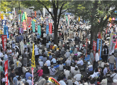 9月23日、秋晴れの空のもと、東京・渋谷区の代々木公園で「さようなら原発」一千万署名市民の会主催の「9・23さようなら原発さようなら戦争全国集会」が行われ、2万5千人が参加した。