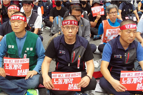 午後3時、民主労総本部のあるソウル市中区・京郷新聞社前の街路を占拠して、ゼネスト大会が開かれた。逮捕令状が出ているハンサンギュン民主労総委員長が現場に登場し、最前列で組合員と一緒に座り込んだ。