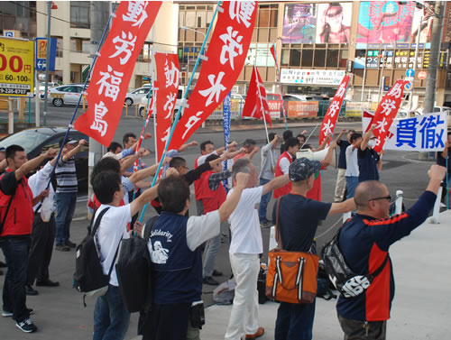 辻川慎一副委員長が、構内で働く労働者に向けて「皆さんの仕事は乗客の命を守り、快適な車両を提供する重要な仕事だ。しかしその皆さんにJRはどういう仕打ちをしているのか。管理者は自分の出世しか考えず、業務に何の責任も取らない。ともに闘い、外注化を粉砕しよう」と呼びかけた。照沼靖功さんは「闘わない労働組合は労働組合ではない。東労組を脱退し動労水戸に結集しよう」と声の限りアピールした。