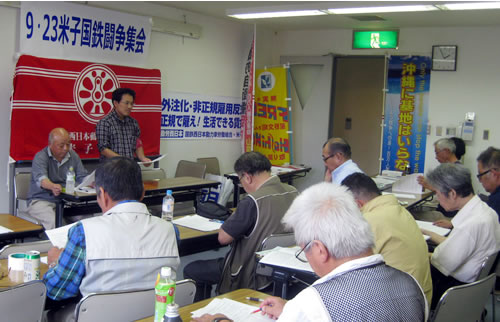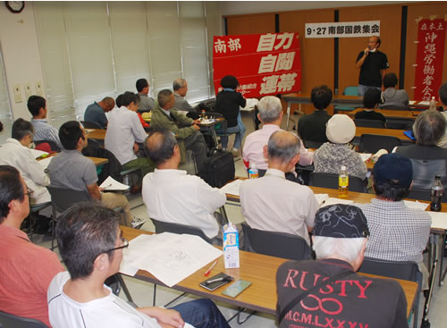 9月27日、品川区内での南部国鉄集会に41人が結集しました(写真上)。国鉄労働者が多数参加し、そのうち6人が発言しました。国労旭川闘争団の成田昭雄さん、JRの駅で闘う労働者、南部労組交流センター代表の国鉄労働者。圧巻は、職場での労災隠しを弾劾したことで雇い止め解雇されたJR関連職場の青年が解雇撤回まで闘うと宣言したことです。