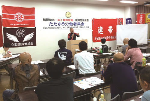 9月27日、茨城県土浦市で国鉄闘争全国運動の「解雇撤回・非正規職撤廃・被曝労働拒否/たたかう労働者集会」が開催された。強制出向の延長と事故続出に対する動労水戸のストを翌日に控える中、50人が参加した。