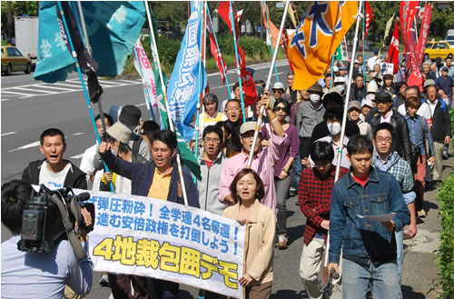 10月14日、公安警察による「監禁致傷事件」デッチあげで不当逮捕された全学連4学生の勾留理由開示公判が東京地裁刑事第14部(中山登裁判官)で行われた。これに先立ち緊急に呼びかけられた正午からの東京地裁包囲デモには、首都圏の学生や労働者を中心に130人が集まり、安倍の意を受けた警視庁公安部の卑劣な弾圧に満身の怒りをたたきつけた。