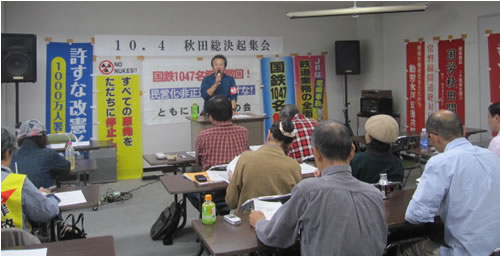 「ともに闘う秋田の会」共同代表のKさんが開会あいさつを行い、国労秋田闘争団の小玉さんが基調報告で全学連4人の不当逮捕を弾劾し、「動労総連合の全国的建設とゼネストで安倍政権を打倒し解雇撤回・非正規職撤廃をかちとろう。国際連帯闘争で戦争は止められる。11・1労働者集会の大成功を!」と力強く提起しました。