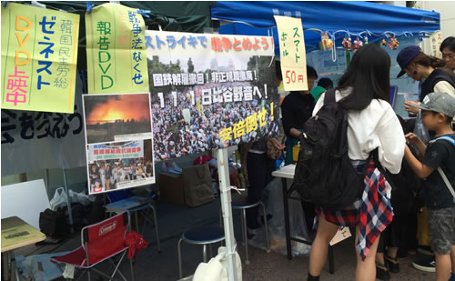 テントには「ストライキで戦争止めよう! 国鉄解雇撤回! 非正規職撤廃! 安倍倒せ!」と大きく書いた看板を出し、決起している世界の労働者の写真展、星野さんの絵画のレプリカなどを展示しました。子どもたち向けのゲーム、民主労総ゼネストと全学連国会闘争報告のビデオ上映会なども行いました。婦民の仲間がステージから11・1全国労働者集会への結集を訴えました。
