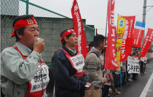 シュプレヒコールの後、吉本書記長と鈴木会計が訴えた。「この先黙っていたら賃金も雇用も切り下げだ。団結すれば勝てることを鈴コン分会は示してきた。御用団体SJK(鈴木コンクリート工業従業員の会)では権利は守れない。鈴コン分会に入って闘おう」