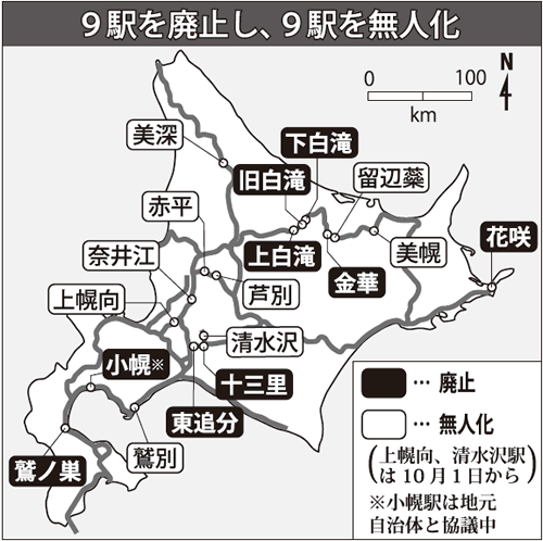 さらにJR北海道は、駅の廃止、無人化を順次打ち出した。現在までにJRが公表している廃止対象は、函館線の鷲ノ巣(わしのす)駅、室蘭線の小幌(こぼろ)駅、根室線の花咲(はなさき)駅、石北線の金華(かねはな)、上白滝(かみしらたき)、旧白滝(きゅうしらたき)、下白滝(しもしらたき)駅、石勝線の十三里(とみさと)、東追分(ひがしおいわけ)駅の計9駅だ。