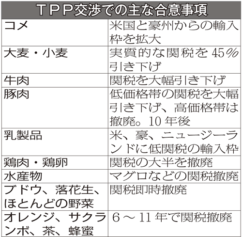 TPP「大筋合意」の内容が小出しに発表され、衝撃が広がっている。全国の農民、農業関係者が「こんな内容は受け入れられない」と怒りの声を上げている。第一に、自民党自身が選挙で掲げた「聖域の農産物5品目」が壊滅的打撃を受ける(表参照)。