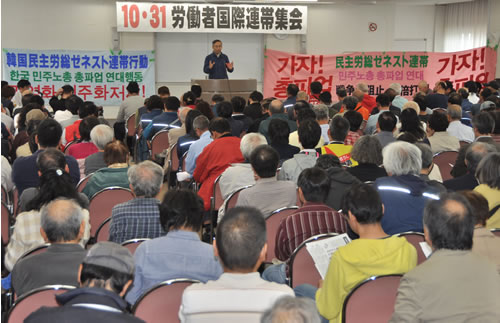11・1労働者集会に向け、10月31日に千葉で開催された労働者国際連帯集会は、韓国、ドイツ、トルコなどの闘う労働者を迎え、在日・滞日外国人労働者をはじめ300人が結集し、新たなインターナショナルをも展望する歴史的な集会となった。世界の労働者はまったく同じ敵、同じ攻撃と闘っている――参加者の誰もがそう確信した。国境を越えた労働者階級の国際連帯・国際的団結こそが、新自由主義攻撃を打ち破ることができる。全参加者は、大恐慌と戦争にゼネストをもって立ち向かい、労働者階級が主人公の世界をつくろうと誓い合った。