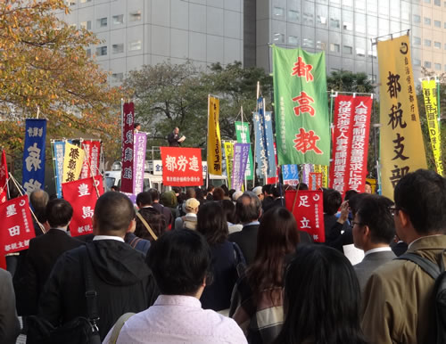都労連(東京都職員4万人)は11月13日に1時間スト、特区連(23区職員5万人)と東京清掃労組(4400人)は20日に時間内29分集会(実質スト)と1時間ストを構え、当局提案の「白紙撤回」と一律大幅賃上げを求める実力の闘いに入った。都労連は都庁前集会を4波、5波と重ね、職場討議や早朝宣伝、団交での応酬と対当局行動を繰り広げている。スト前夜の都庁包囲デモと泊まり込み、当日の全庁舎封鎖のピケット態勢も整いつつある。12秋季年末闘争は、都労連29分ストと特区連の決起を頂点に、大量処分をはね返して実力でかちとられた。安倍を直撃した13年4・26自治労全国ストを切り開いた闘いをよみがえらせよう。