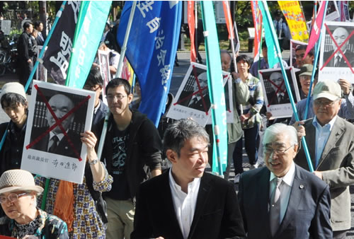 アピールを受けて元気よくデモに出発した。参加者は寺田逸郎最高裁長官の写真に大きな赤い×印をつけたボードを掲げた。裁判員制度があまりにも不人気なため、今年の記載通知には寺田長官の顔写真とサイン入りの「ごあいさつ」を入れて「ご協力をよろしくお願い」するという。これについては「やりたくない人がますます増えるだけ」というのが街の声だ。こんな小細工しかやれなくなっている最高裁に対する痛烈な弾劾だ。