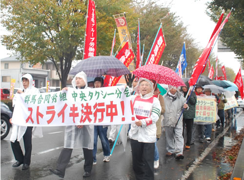 11月8日、群馬合同労組中央タクシー分会の3人の組合員が、違法な長時間労働や組合つぶしのための乗務はずしを行う会社に対して断固とした24時間ストライキに立ち上がった。群馬合同労組の組合員を始め60人がスト支援に駆けつけ、社前での宣伝活動と藤岡市内のデモをともに闘った。分会は、半年前の6月9日に結成されて以来、会社による組合つぶしの悪辣(あくらつ)な攻撃と闘ってきた。11・1全国労働者集会に分会として決起し、集会後の交流会で合同・一般労組全国協の仲間との団結を打ち固める中で今回のストライキに立つ決断が生み出された。