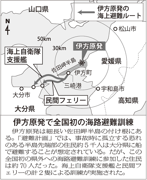 また、今回の訓練の狙いは「避難計画があれば大丈夫。被曝もしない」という「新たな安全神話」をねつ造することであった。そのメーンが「原発以西の佐田岬住民は船で大分へ」という「避難訓練」の実施であった。しかし逆に、訓練を通して地域住民、高齢者や重度の要介護者を無理やり外に連れ出し、被曝させ、命を奪うとんでもない「計画」であることが鮮明になった。