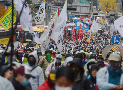 民主労総の11・14民衆総決起は、労働者の団結した力とゼネストが社会を変えることを鮮明に示した。ソウルでの15万人の大闘争は、労働組合が市中心部を制圧、解放し、これを背景に光化門と青瓦台(大統領府)に進撃した。そして7時間にわたる警察との大激突が展開された。それは労働者・労働組合の原則的な闘いと、ゼネスト・実力決起こそ、侵略戦争阻止とパククネ政権打倒・労働者権力樹立の力であることを示した。