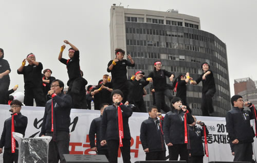 韓国民主労総の集会に、今回初めて参加しました。会場入りして、まず人の多さに圧倒されました。会場であるソウル市庁前広場はもちろんのこと、周辺の道路も含めて10万人の労働者で埋め尽くされており、韓国労働者の団結の強さを実感しました。
