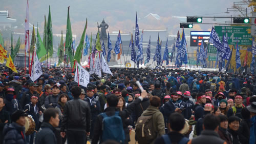 また、国家権力に追われている民主労総ハンサンギュン委員長が公衆の面前に姿を現し闘いの決意を表明しました。非常に強い意思のもとに闘争し、権力と対峙(たいじ)する不屈の闘志を示す姿を見ました。「闘争(トゥジェン)!」その掛け声はまさにすべての労働者階級の心をつかみひとつにする的確なフレーズでした。韓国語を理解できない私も、この言葉が聞こえた瞬間身が引き締まる思いです。そしてそれは日本の体制内労働運動に欠けている精神でもあります。われわれ労働者階級はその精神をこそ大事にしなければなりません。