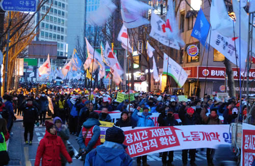 ソウル市庁前広場の集会では、逮捕状の出ている民主労総のハンサンギュン委員長が映像メッセージで、国家暴力で労働者民衆の闘いをとめることは絶対にできないと力強く訴えた。労働者・農民・貧民・市民団体によって構成される民衆総決起闘争本部の宣言文(3面掲載)が読み上げられ、民主労総の12・16ゼネスト突入と連帯して、12・19第3次民衆総決起闘争を大規模・全国同時多発の大闘争として闘う方針が打ち出された。