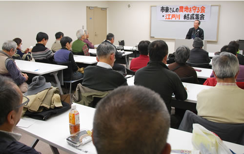 12月6日、東京都江戸川区内で「市東さんの農地を守る会・江戸川」の結成集会が開かれ、30人が参加した。「江戸川産直の会」が中心となり、千葉県成田市天神峰の農家、市東孝雄さんの農地を守り営農を支えるために生まれた会だ。