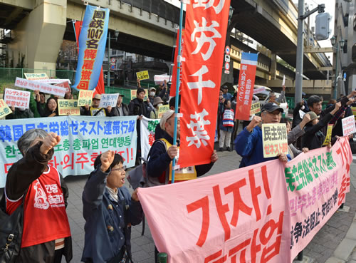 韓国大使館に抗議 〝韓国労働者の声を聞け〟 動労千葉先頭に60人