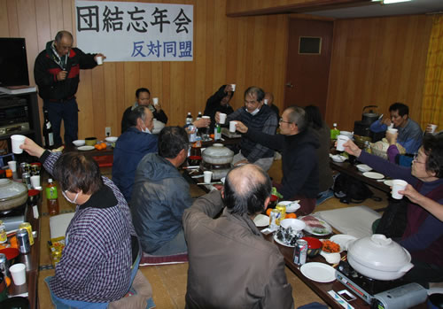日が暮れてからは、年末恒例の反対同盟の団結忘年会が開かれた。太郎良陽一さんの音頭で盛大に乾杯し、市東さんと萩原富夫さんがあいさつを述べ、1年の激闘をねぎらった。支援連の仲間も一人ひとりが飾らない言葉で抱負や決意を語り、全員で大いに食べ飲み、カラオケを楽しみ、明日への英気を養った。
