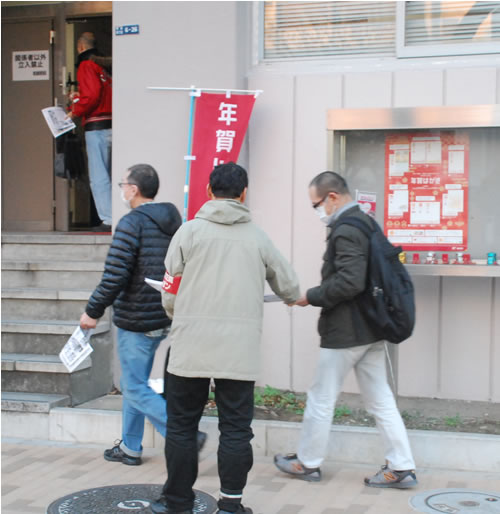 「明けましておめでとうございます」「元旦からご苦労様です」。出勤してくる労働者に次々とビラを手渡していく。A局では「頑張ってますね」「今年もよろしく」と何人もの労働者が声をかけてきた。B局では「いつもビラ読んでますよ」と、毎月のビラまきで顔なじみになった労働者が笑顔を見せた。