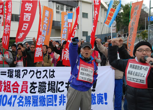 JR東日本の子会社で清掃業務を請け負う東日本環境アクセスは、フルタイムで働く労働者をいつまでも非正規職にとどめて超低賃金でこき使い、その非正規職も「パート社員」「契約社員」に分断している。そして、この仕打ちに対する憤りを表明した時廣組合員を昨年12月、不当にも解雇した。これは、昨年2月の結成以来、桑原豪臣組合員への度重なる雇い止め解雇の策動を粉砕してきた動労神奈川への不当労働行為にほかならない。そこには明らかに東日本環境アクセスだけでなくJR東日本の意思が働いている。