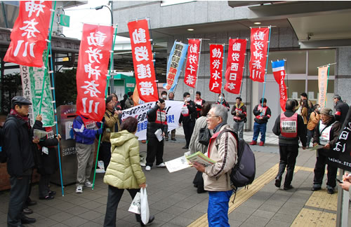 動労総連合の各組合旗を林立させての街頭宣伝は、圧倒的な注目を集めた。1時間の宣伝で500枚以上のビラが受け取られ、JRに対し1047名の解雇撤回を求める署名も50筆以上が寄せられた。