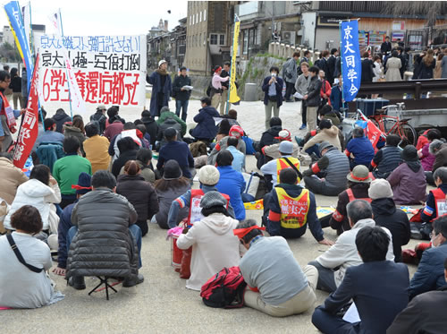 「反戦ストライキが犯罪だと! 安倍の戦争攻撃許さない!」----3月13日の「6学生奪還!京都デモ」は、180人の学生・労働者の結集で大成功した。デモに先立ち三条大橋のたもとの河原で集会(写真)。同学会に結集する京大生や熊野寮生を先頭に、動労西日本や関西合同労組を始め全関西から駆けつけた労働者、全国の学生自治会が次々とアピールした。「ストライキが生きる道です」(作部羊平・同学会委員長)などの獄中メッセージも紹介された。三条大橋は見る見るうちに道行く人が立ち止まり鈴なりとなった。