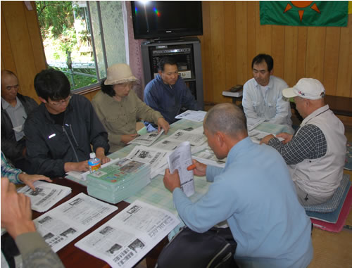 午前8時30分に天神峰の市東孝雄さん宅離れに集合し、この日配布する「反対同盟ニュース」第32号の折りなどの準備作業と打ち合わせを行った(写真上)。