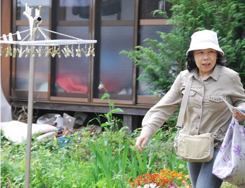 全学連三里塚現地行動隊は訪れる先々で歓迎され、空港問題のほか舛添要一都知事の金銭腐敗問題などでも住民との会話が大いに弾んだ。婦人行動隊の宮本麻子さんは、成田市川上地区を精力的に回り、同盟ニュースを届けた(写真下)。さらに第3滑走路予定地とされる地域、騒音地域にニュースを配り、 滑走路1千㍍延長、24時間空港化策動に対しても怒りが引き出された。7・3東京集会のカラービラも評判は上々で、「反対運動もすでに50年か!」と関心を呼んだ。