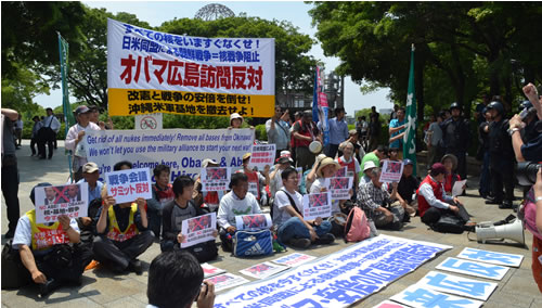 安倍の先兵である日本の警察権力は、被爆地・ヒロシマの怒りと闘いを圧殺するために、大地震の被災地である熊本などからも含め全国動員で異様な弾圧態勢をとった。広島市内ではいたるところに警官が立ち並び、声も上げられない状態がつくり出された。日本のマスメディアや日本共産党などすべての体制内勢力も、こぞって「オバマ歓迎」を演出した。