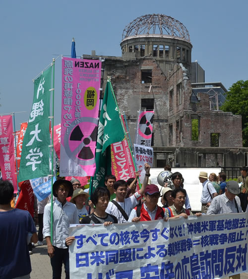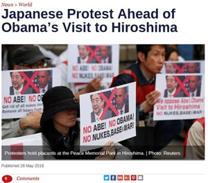 安倍は被団協(日本原水爆被害者団体協議会)の一部幹部らのみを選別して平和公園に招待し、オバマとの会話とハグを演出した。だが原爆ドーム前集会で何人もの発言者が叫んだ「オバマは謝罪しろ。核のボタンを持ってここに来るな」というのが、圧倒的な被爆者の怒りの声だ。