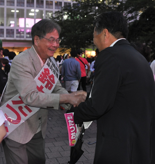 ハチ公前では、鈴木候補に握手を求める人が何人も現れ、新たな団結がどんどん拡大した。