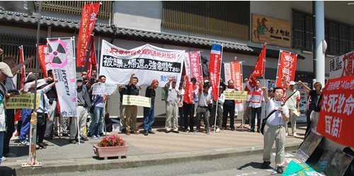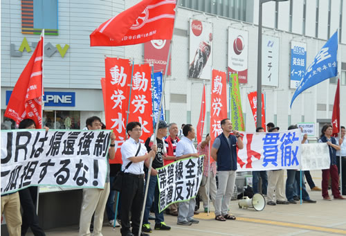 正午には動労水戸がストライキに入った。動労水戸組合員は午後3時、いわき運輸区前に結集し、JRを徹底弾劾、併せて運輸区の労働者に被曝労働拒否の闘いにともに立つことを訴えた。いわき駅前での宣伝行動が続けて行われた。