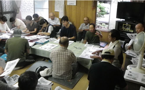 午後6時、市東さん宅離れでの集約で、それぞれの一日の報告を出し合った。第3滑走路計画への数々の怒りとともに、羽田空港の新たな都心飛行コースの設定に対し東京23区で反対集会が開かれていることについて「知っている」などの住民の共感の声が報告された。また「有志の会」の新しいパンフはまったく配られていない現状が判明した。