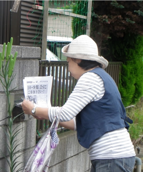 「反対同盟ニュース」36号と10・9集会ビラを持ってそれぞれが一斉に担当地区に向かい、丸一日の宣伝活動を展開した。伊藤信晴さんは芝山町を回って「第3滑走路実現を目指す有志の会」の利権団体としての正体を暴露し、日程も打ち出せない4者協議会の追い詰められた姿を暴いた。
