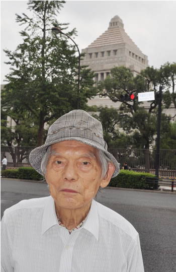 西川重則さん 1927年、香川県生まれ。とめよう戦争への道!百万人署名運動呼びかけ人・事務局長、平和遺族会全国連絡会代表主な著書 『「昭和館」ものがたり』/『「靖国」増補版―有事法制下の靖国神社問題』/『「新遊就館」ものがたり』/『わたしたちの憲法―前文から第103条まで』ほか多数(写真は、臨時国会が開会した9月26日、国会前に立つ西川重則さん)