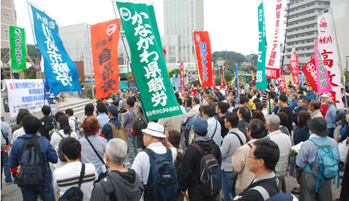 10月1日、横須賀市ヴェルニー公園で、「原子力空母ロナルド・レーガン横須賀配備抗議!母港撤回を求める全国集会」が、神奈川平和運動センターと三浦半島地区労の主催で行われ、1800人の労働者・市民が結集した。