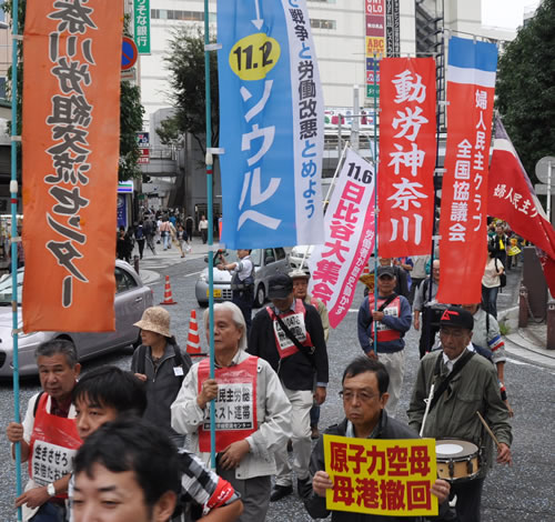 10月10日からロナルド・レーガンも参加する米韓合同演習が強行されるなど一触即発の戦争情勢が深まる一方、民主労総がゼネストで闘っている激動情勢の中での闘いとなった。1973年の空母ミッドウェー配備以来43年。空母母港化撤回をかけた横須賀闘争は最大の決戦局面を迎えている。日韓労働者の連帯で朝鮮侵略戦争を阻止することが勝利の道だ。集会には既成の枠組みを越えて民間や電機などの労働者も結集し、会場ではあちこちで討論の輪が生まれ、教職員組合の大隊列をはじめ、集会後のデモは主催者発表を大きく上回った。