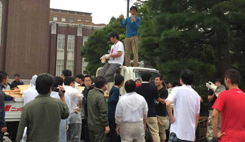 正午、全京大生・教職員の圧倒的な注目の中で集会が始まった。作部君は「『平穏な教育研究環境』『大学の秩序』の名で進められる戦争を止めるため、大学全体を停止させる盛大なバリケードストをやろう!」と訴えた。クスノキ前には集会妨害のために職員数十人が現れたが、朝に一敗地にまみれた彼らは、集会を遠巻きに見ることしかできない。学生部長に処分撤回署名を提出しようと学生が向かうと、彼らは脱兎(だっと)のごとく逃げ去った。