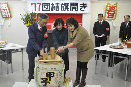 (写真 田中委員長と家族会が分割・民営化に決着つける決意を込めて鏡開き【1月7日 DC会館】)