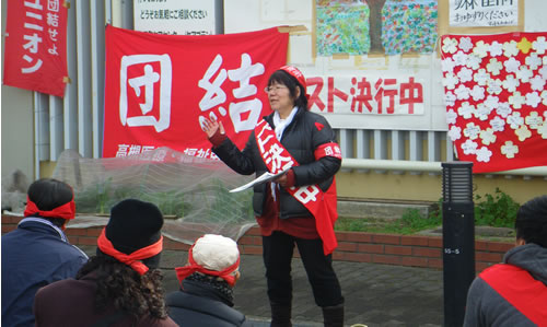 12月21日、高槻医療福祉労働組合が結成以来初となるストライキに突入しました。このストライキは、16秋闘における一時金交渉において、大阪府高槻市の富田町病院など四つの医療・福祉関連法人のうち1法人のみ0・5カ月分という超低額回答を出してきたことに対するものです。高槻医療福祉労組はこの4法人の労働者を組織する労働組合です。経営がほぼ一体であることから、労組は4法人統一回答を要求し続けており、昨年の夏季一時金は1・2カ月の統一回答を得ました。労組は今回の分断回答に対し、統一回答と一時金アップを要求して、村山裕子執行委員長を先頭に5人の組合員が全日・半日のストに立ちました。