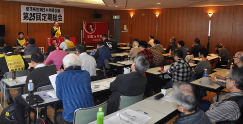 12月23日、部落解放東日本共闘会議の第25回定期総会が東京・浅草橋区民館で開催された。50人が11月国際共同行動の熱気をもって参加した。そして、朝鮮侵略戦争が迫る中で韓国・民主労総のゼネストに応えて、17年は国鉄決戦と都労連決戦を闘うことをとおして労働組合の拠点をつくる、その力で非正規職を撤廃させる、石川一雄さんを狭山事件の犯人とした狭山裁判の再審を行わせる、全国水平同盟の支部をつくるという方針を決定した。