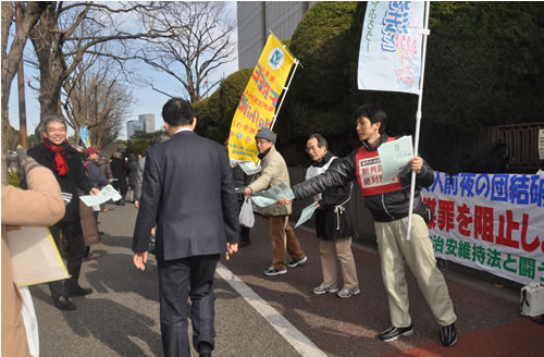 1月19日、現代の治安維持法と闘う会が呼びかける新共謀罪国会提出阻止の昼休み街宣が東京地裁前で行われた。公安警察の全学連大会襲撃に対し告訴・国賠で闘う全学連、星野文昭さんをとり戻そう!全国再審連絡会議、杉並救援会などとともに、極悪の団結禁止法=共謀罪の成立を絶対に阻もうと霞が関を往来する人びとに訴えた。