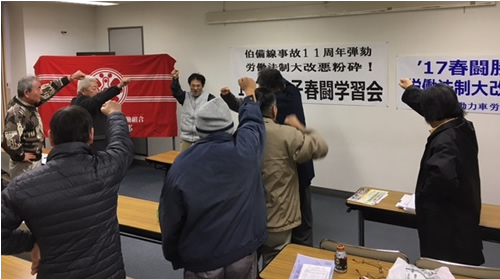 意見交換では、来賓の動労西日本・山田和広書記長が17年方針の核心点を明らかにした上で、「1〜3月春闘を動労総連合青年部建設を最先端とする組織拡大決戦として闘いぬく。3・4ダイ改阻止へ、大阪・広島でストライキを打ち抜く」と鮮明に決意表明した。